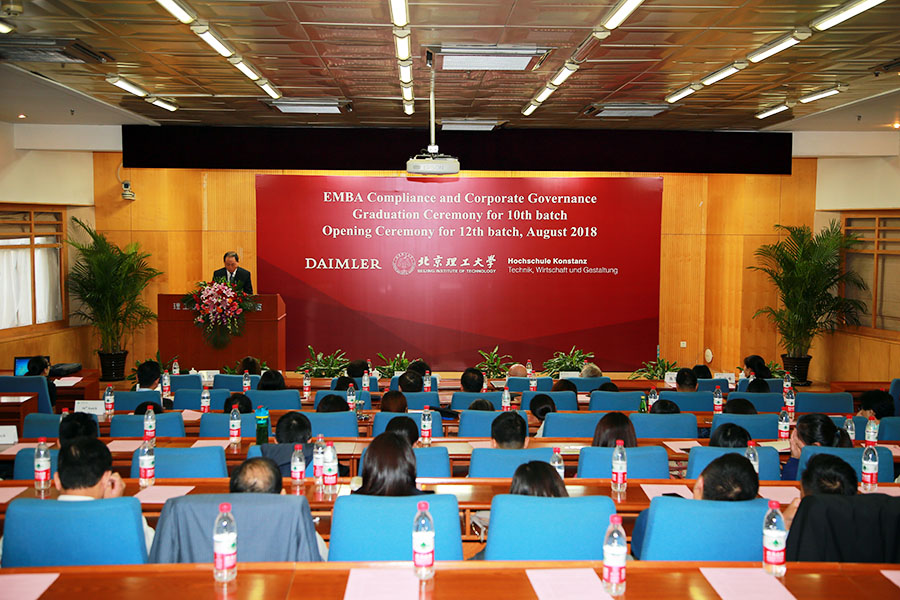 2018年8月31日下午,beat365中文唯一官网与德国康斯坦斯应用科学大学合作为国际著名奔驰汽车生产商戴姆勒公司举办的EMBA项目第十期毕业典礼暨第十二期新生开学典礼在我校国际教育交流大厦三层报告厅隆重举行。出席此次开学典礼的嘉宾有:戴姆勒大中华区人力资源部总经理满静、康斯坦斯应用科学大学首席教授Josef Wieland、继续教育部主任Roland Luxemburger、beat365中文唯一官网国际交流合作处处长唐水源、国际交流办公室主任毛宇峰、beat365中文唯一官网院长梅文博、副院长蒋志湘。典礼由梅文博院长主持。